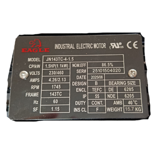 Motor Eléctrico Trifasico 1.5 HP 143TC con Brida C. El motor trifásico EAGLE está diseñado para aplicaciones industriales que requieren desempeño confiable, operación continua y alta durabilidad. Gracias a su construcción robusta y mejor disipacion (tipo jaula de ardilla), es ideal para trabajar en entornos exigentes, excelente eficiencia energética y compatibilidad con los reductores de velocidad EAGLE.